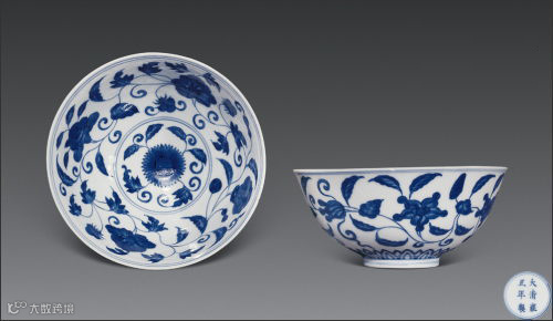 此碗器型、文样皆仿明成化青花碗。内外壁绘缠枝花,内底绘折枝花,其胎体之轻盈坚致,釉面之晶莹光润,青花之幽靓雅洁及色调之淡雅清丽,可说直追成化官窑青花,几欲乱真。
