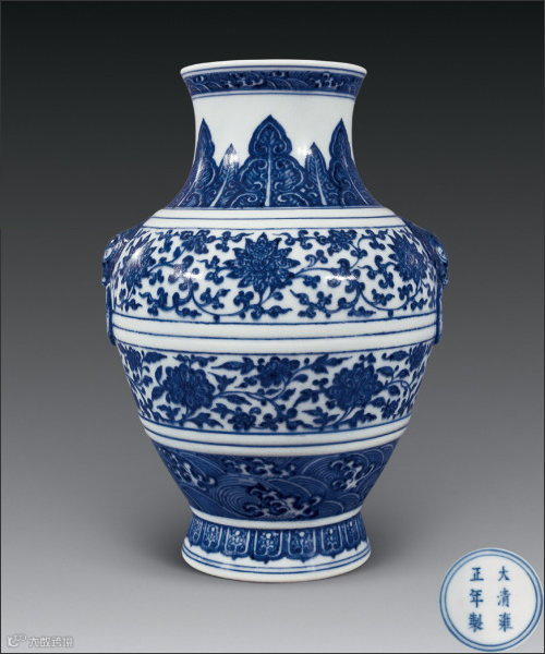 敞口束颈,丰肩鼓腹,敛胫圈足,肩贴饕餮衔环双铺首,器型古雅端庄。自上而下分绘海水江崖纹、变形芭蕉叶纹、缠枝莲纹、覆莲瓣纹等六层纹饰,其间以突起的弦纹相隔,使器型更富于变化。运用模仿明代永宣青花画风的点染画法,全器绘画流畅细腻,层次清晰,青花鲜艳浓郁,釉面匀莹润泽,品相完美。目前所知,与其相同者仅有一件,弥足珍贵。