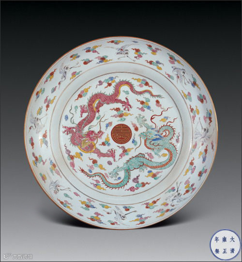 此盘造型规整,施彩丰富绚丽,寓意吉祥,雍容华美,亮丽典雅,传世罕见,应是景德镇御窑厂为皇帝特制的祝寿大器,不同于例行烧制的普通官窑瓷器,堪称雍正窑大器精品,殊为难得。据已公开资料:这种大盘传世仅有2件,除本拍品外,器型、纹饰、尺寸完全相同的另一件大盘见于香港佳士得2003年10月拍品667号、北京翰海2004年春拍品1792号。