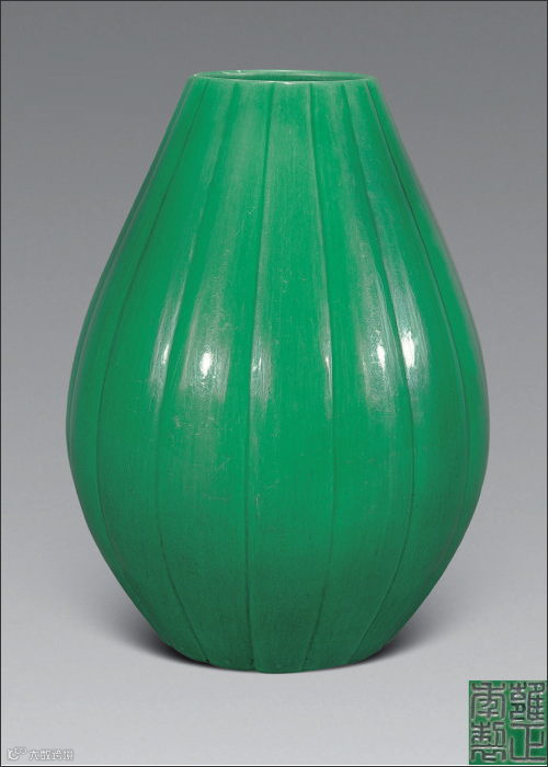 单色釉瓷器纯净典雅,少人工匠意而富天然韵致,去雕饰之美而独存魅人色彩,一直为世人所重,雍正皇帝对此也百般追求。在位期间对内府所藏官、汝、哥、钧等宋瓷颇为灵情,屡命内务造办处奉宋旧器至御窑厂仿造,加上有唐英如此杰出的艺术家竭力钻研督造,仿古创新集诸色之大成,从而使清代单色釉瓷器制作步入历史的颠峰,让后世望尘莫及。翠绿釉瓜棱罐,呈瓜棱形,敛口,硕腹,圈足,素地无纹,通体及内壁施翠绿釉,发色匀净,清澈晶莹。底刻“雍正年制”篆书款。品相完美。