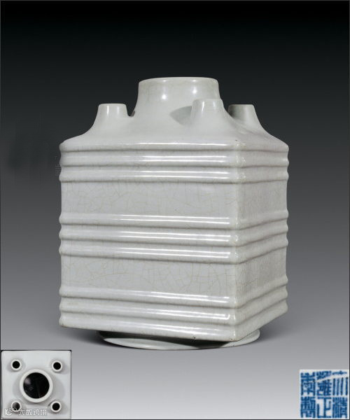 此为雍正朝创新器型,短颈,方体,肩饰五孔,器身自上而下以三组突起的等距弦纹为饰,使器型更富于变化。通体施仿官釉,釉质莹润凝厚,遍“金丝铁线”开片。胎体厚重,造型古朴。