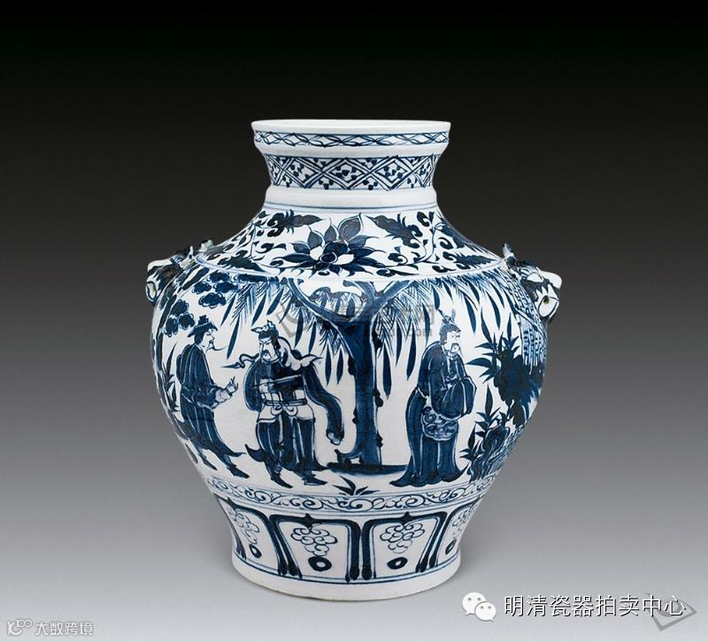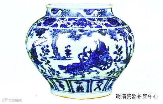 人物故事纹是元青花装饰中最为后人称道的装饰题材,与其他动植物纹样相比,绘有人物故事图案的元青花器物虽然较为少见,但几乎件件可称得上是稀世珍品。从已知资料来看,元青花上的人物故事图案主要见有“萧何月下追韩信”、“刘备三顾茅庐”、“蒙恬将军”、“文姬归汉”、“周亚夫细柳营”、“昭君出塞”、“尉迟恭救主”、“四爱图”等,此外还有一些难以分辨人物情节的图案。这些图案的故事内容多取材于民间喜闻乐见的著名历史人物故事,显然它与宋元时期话本小说的流行及元代戏剧的发达有着密切的联系,反映了文学艺术对元代陶瓷装饰工艺的深刻影响。