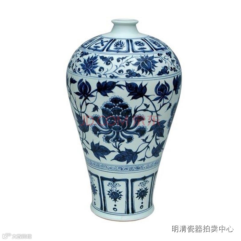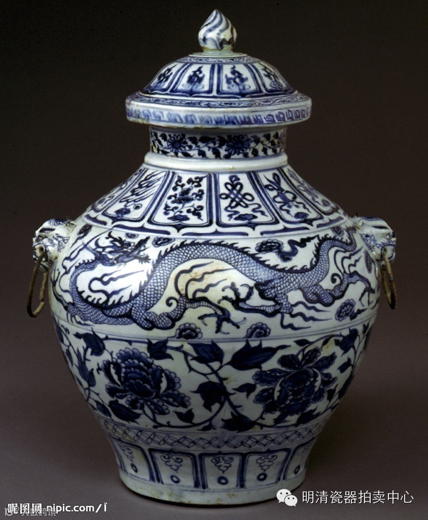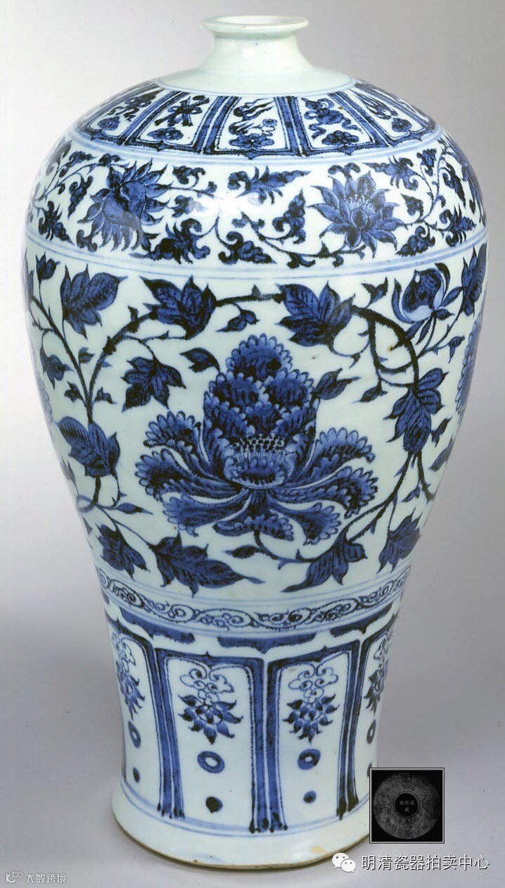 元青花装饰除主题纹饰特点鲜明之外,许多辅助纹样也有着独特的时代风格,其中尤以变形莲瓣纹和云肩纹表现最为突出。变形莲瓣纹是最能代表元瓷特征的辅助纹样之一,除元青花瓷之外,亦见于同时期景德镇窑的卵白釉、青白釉产品以及元代龙泉窑青瓷装饰之中,其画法一般以外粗里细的两道线勾勒莲瓣的轮廓线,每片莲瓣之间不相连,即留有一定的空隙,莲瓣内加绘有花朵、云朵、火焰或琛宝纹。琛宝也称杂宝,元代杂宝纹常以火珠、犀角、古钱、银锭、葫芦、莲花、灵芝等组成,但组合并不固定。这种变形莲瓣纹多装饰在器物的口边、肩或足胫部,有绘一周的,也有在不同部位多绘至四周的,但都不作主题纹饰。云肩纹又称如意云头或灵芝头,俗称大云肩,多绘画在器物的颈肩部,纹内一般绘有各种繁密的动植物纹样,因其借鉴于元蒙贵族服装上的肩部织绣纹样而来,故而得名。