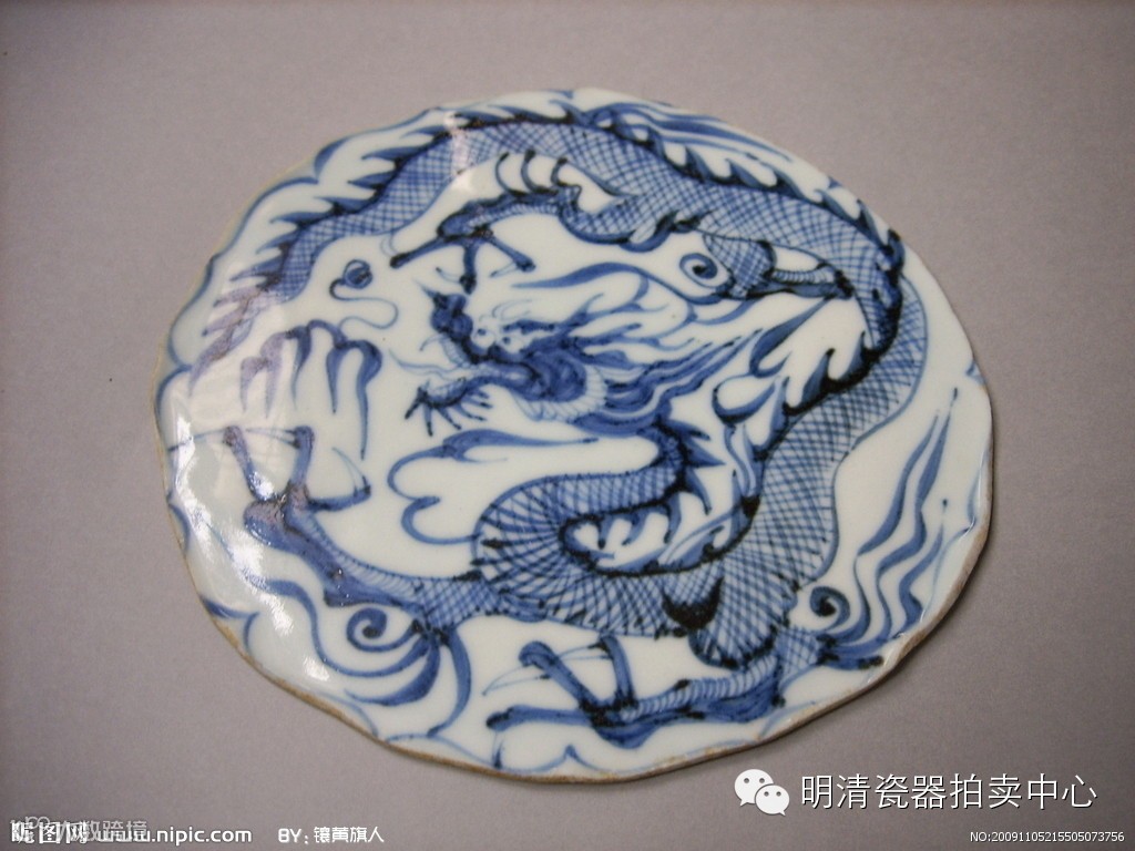 麒麟纹是元青花装饰中富有时代特征的题材之一,麒麟为传说中的祥瑞之兽,在元青花纹饰中其形象特征是鹿头、牛蹄、马尾,并常与花草、瓜果纹组合成画,也有与龙凤纹同时绘于一器的。