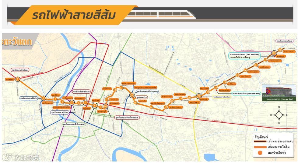 橙色线作为曼谷市区唯一一条贯穿城市东西方向的线路,不仅串联了曼谷开通最早人流最密集的轻轨绿色线及地铁蓝色线,此外还连接了其他的4条新的线路(分别是粉色线,黄色线,紫色线和红色线),整条线路还将经过曼谷发展最早,最核心的各大区域,重要程度可见一斑。