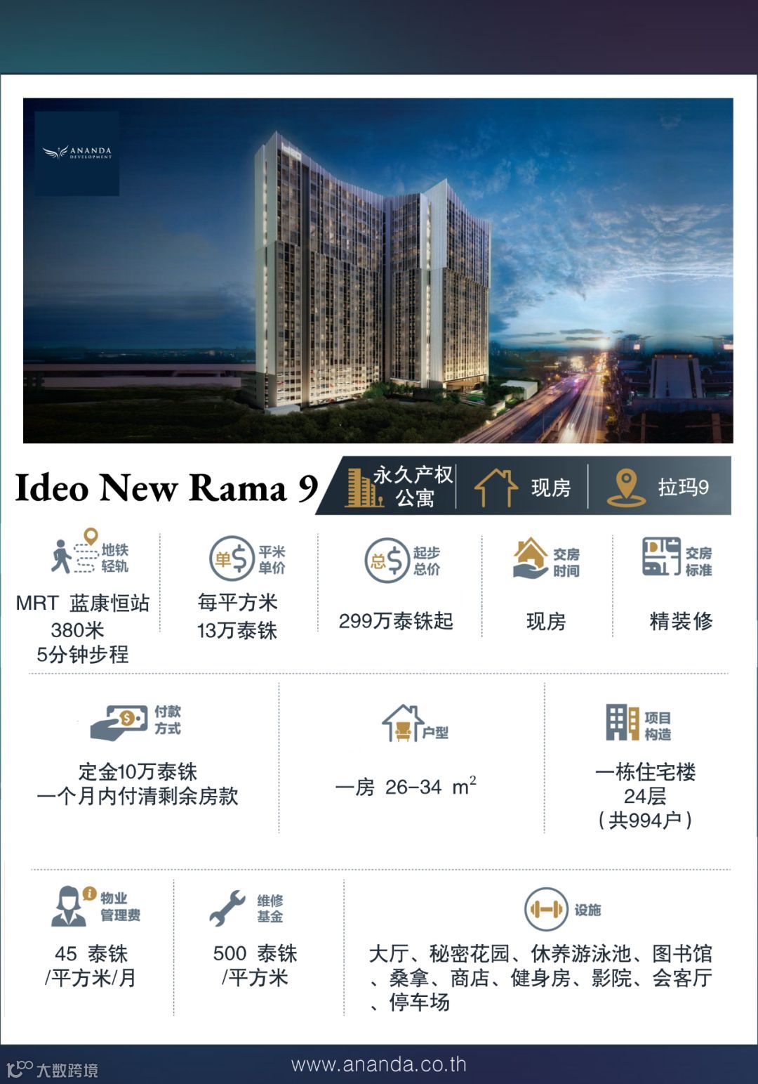 离地铁橙色线站点380米,赠送价值50万泰铢的5年泰国长居尊荣签证