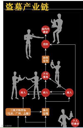 一个国际市场的平台,给中国古墓盗掘和文物交易提供了全球化土壤。产业链就像一架庞大的机器,把散落在世界各地分散的盗墓活动,组合成强大有序的生产运动。全球800亿美元的文物年交易额,有赖于从产到销每一个环节的顺畅自如。人们不禁要问,指挥与操纵这架机器的究竟是些什么人?