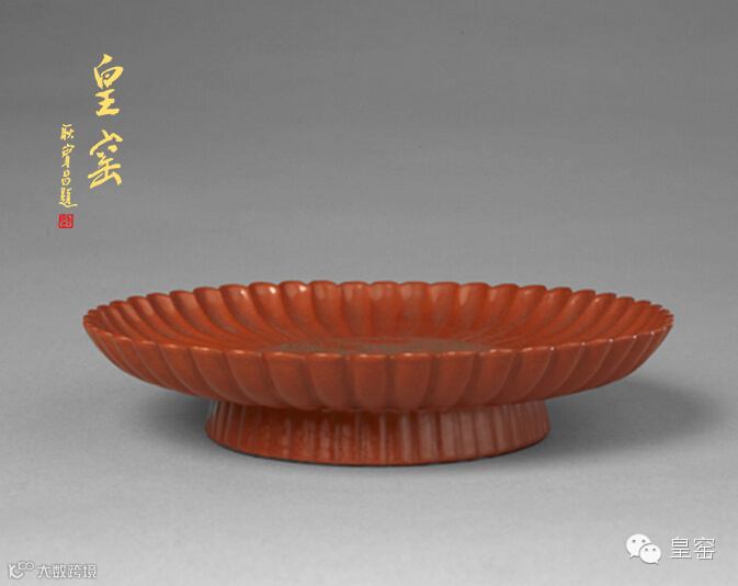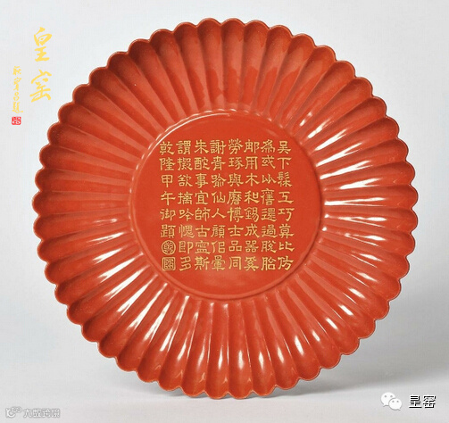 盘敞口,浅腹,圈足。盘壁呈菊瓣形,盘内及外壁均施仿朱漆釉。外底为仿黑漆地,上以金彩书“大清乾隆仿古”六字楷书款。内底微凸起,以金彩书写乾隆帝御制诗:“吴下休工巧莫比,仿为或以旧还过。脱胎那用木和锡,成器奚劳琢与磨。博士品用谢青喻,仙人颜侣晕朱酡。事宜师古宁斯谓,拟欲摛吟愧即多。乾隆甲午御题。”下仿篆书印两枚“乾”、“隆”。