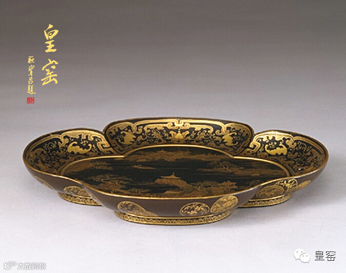 此盘仿漆器描金工艺,造型端庄,制作精细,色彩对比强烈,给人一种雍荣华贵之感。