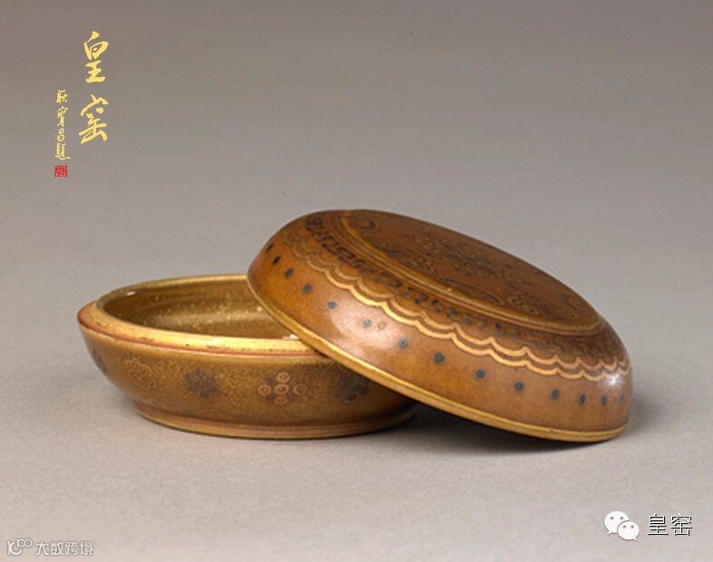 盒扁圆形,盖面凸起,圈足。通体以酱釉为地,满饰金彩,并以金、银彩描绘纹饰。盒身口沿下绘朵梅边饰,近足处绘如意云纹。盒盖口沿处绘圆点纹、水波纹,盖面中心绘一变形西番莲,四周绘如意云纹。底以金彩书“大清乾隆年制”三行六字篆书款。