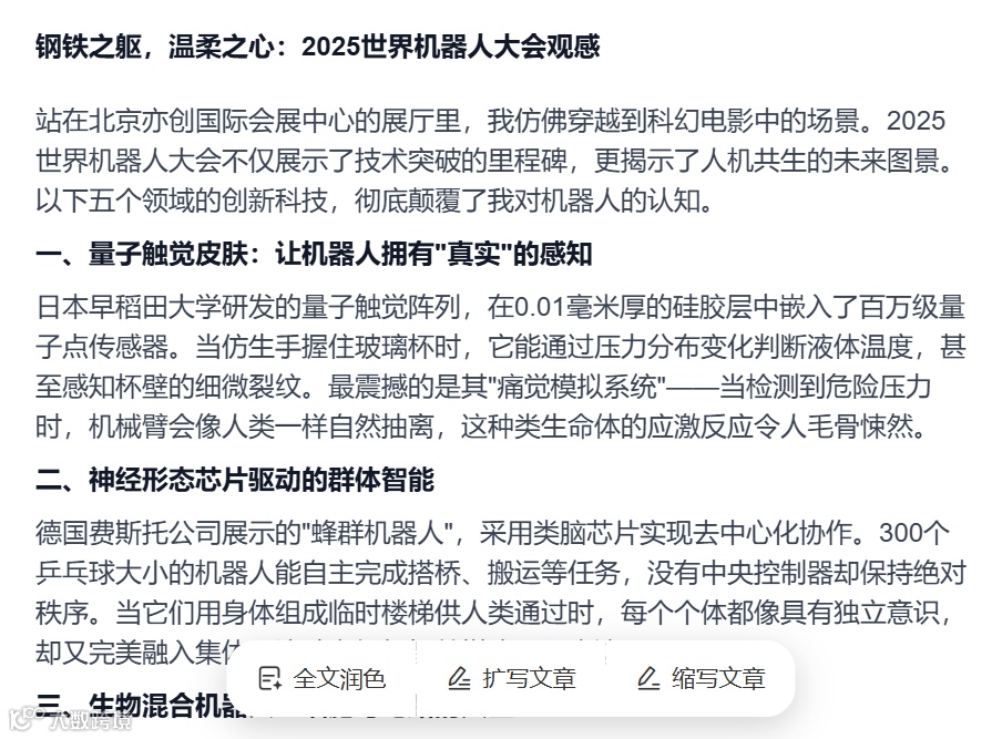 再如AI写作,搜索“参观2025世界机器人大会的感想,描写对5个机器人创新科技的震惊,1200字左右”,约2秒钟生成了一篇基本符合要求的文章。而且文章提到的创新科技,均为真实存在,而不是“一本正经的胡说八道”。