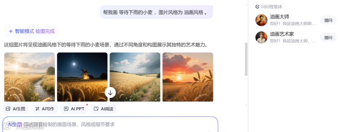 例如用百度AI生图画“等待下雨的小麦,油画风格”,很快就生成了4幅相关的油画。根据生成结果提更加具体的要求,不断优化,结果也将更加符合期望。百度搜索还推送了相关的智能体服务,为用户提供更丰富的选择。