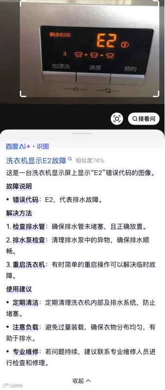 再如将一张洗衣机出现BUG的画面拍照上传,百度搜索不再是给出相似的图片,而是直接根据图片判断故障原因,甚至用AI给出了解决方法。