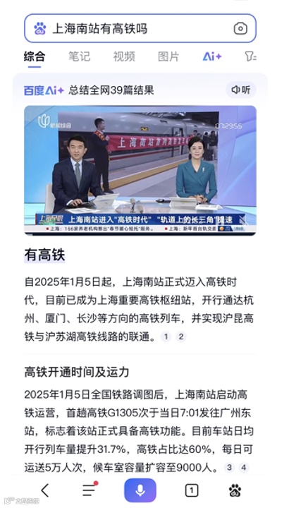 例如,搜索“上海南站有高铁吗”这个问题,搜索结果首先是一段官方新闻视频,对上海南站开通高铁进行的报道,为结果真实性提供了极高的证明。接下来是对问题进行解析,比如高铁开通时间、运力等,为用户提供了更丰富的结论。一言以概之:让最有用的内容以最适配的多模态富媒体形态展现。