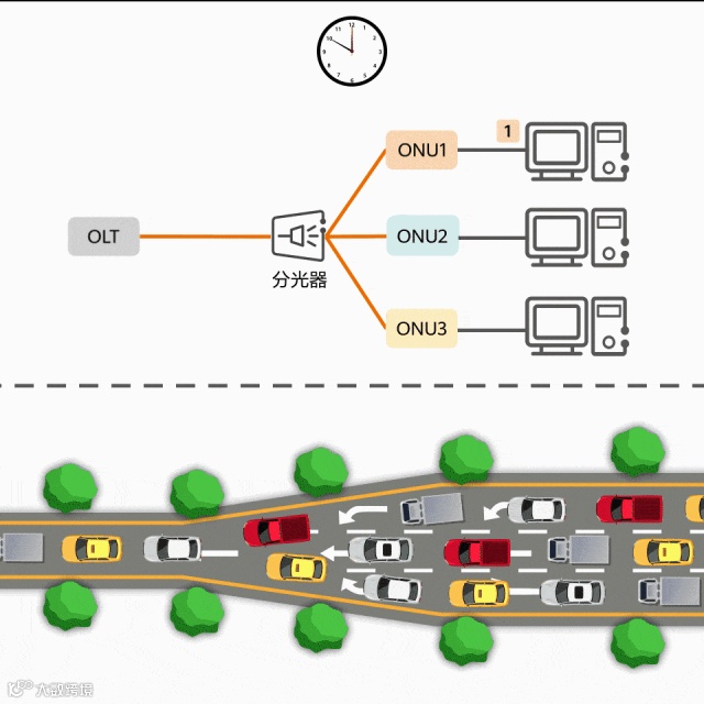 在PON网络中,一个OLT(Optical Line Termination 光线路终端)的PON口下会连接多台ONU(Optical Network Unit光网络单元)设备,上行数据采用TDMA共享信道方式传输,由OLT统一给一个PON口下的所有ONU统一分配发光时隙,也就是说在每个时刻,只有一个ONU可以发光传输上行数据,其他的ONU要排队。这就好比本来是多个车道,到OLT那里需要合并成一个车道,体验过高速堵车人都会知道是多么崩溃。