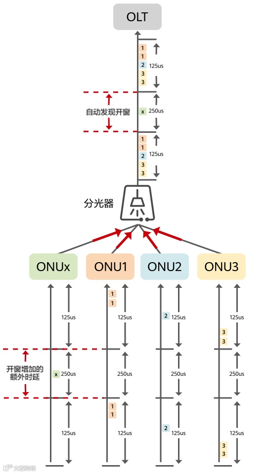 由于典型PON系统允许的ONU距离需要覆盖0~20km,在光纤上传输的往返时延差达到200us,再加上开窗时ONU的随机时延48us以及ONU响应时间2us,因此PON网络中自动发现ONU上线的开窗时间预留了250us,这个过程会额外引入250us的时延抖动。