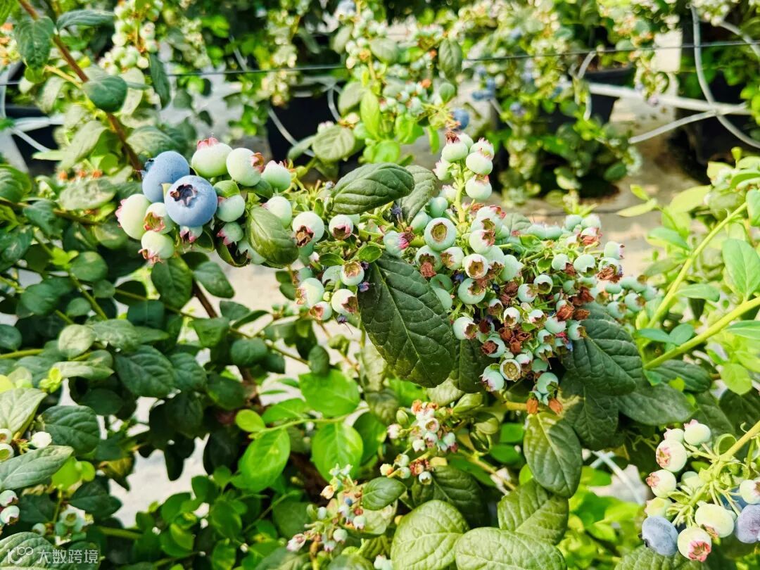 ▲冯威基地里的蓝莓盆栽正处在膨果期,半个月后全部变色即可采摘。李康|摄