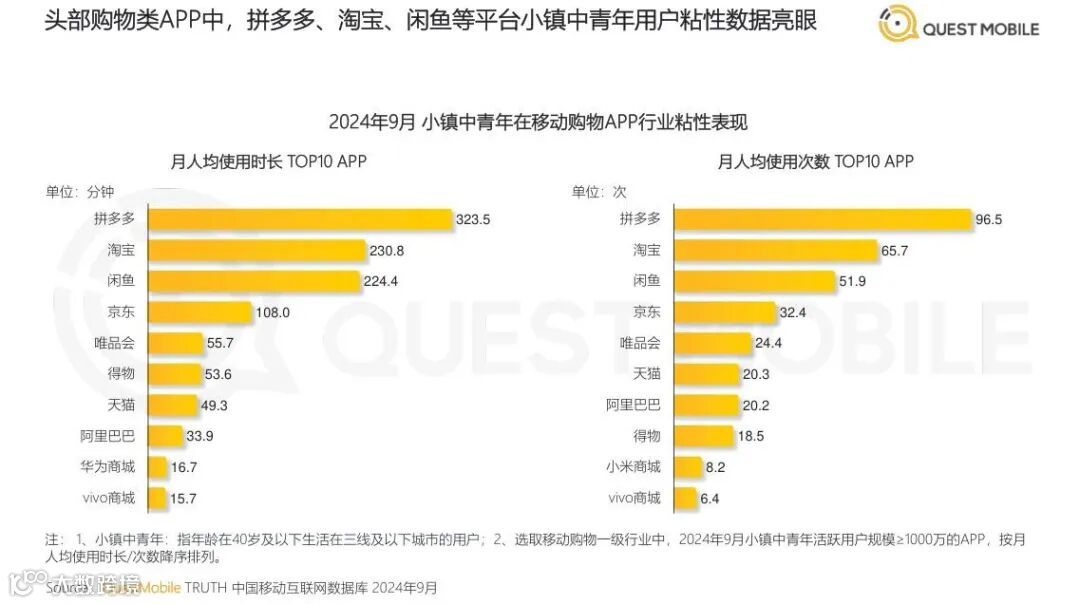 ▲小镇中青年在移动购物App行业粘性表现 数据来源:QuestMobile
