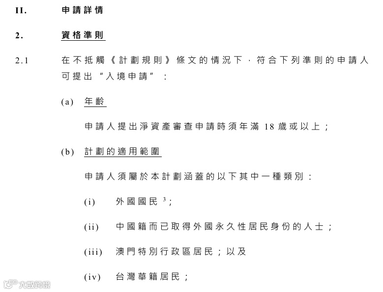 申请人须年满18周岁,过去6个月有3,000万净资产并计划在香港做出3,000万的投资。内地人士需要同时持有第三国绿卡。