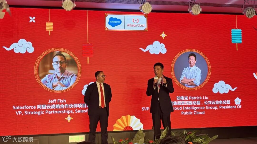 图:Salesfoce阿里云战略合作伙伴项目副总裁Jeff Fish(左)和阿里云智能集团资深副总裁、公共云业务总裁刘光伟 (右)现场发言