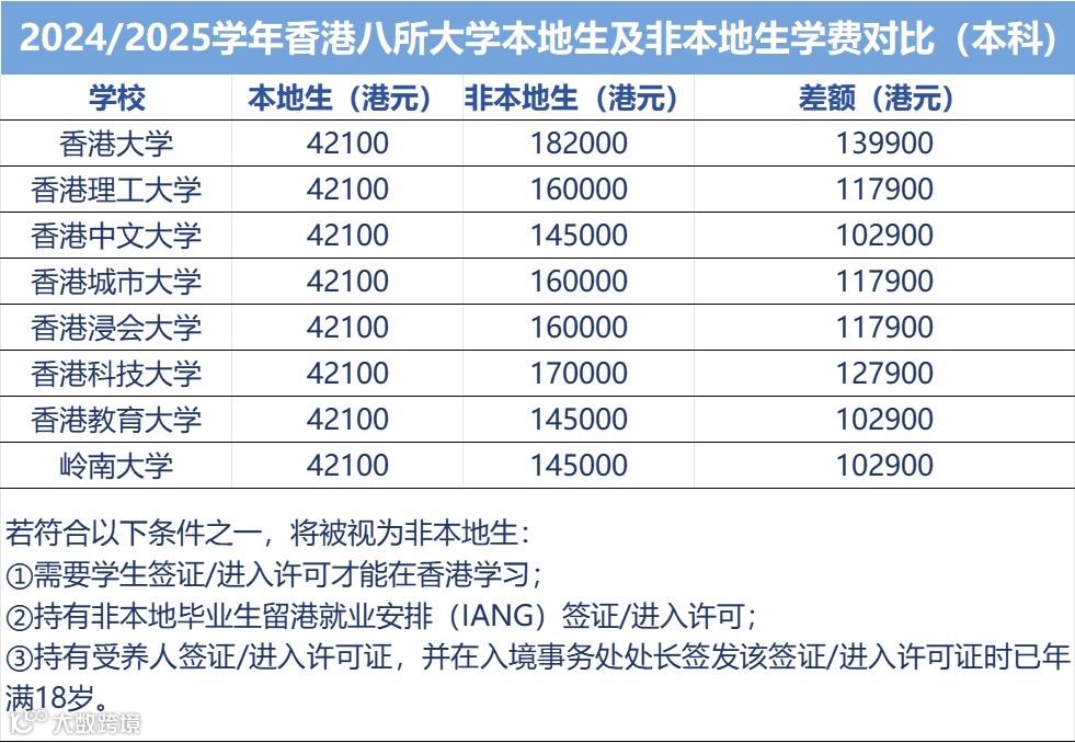 有香港身份的学生在香港读大学,不管是本科生还是研究生,学费都比非本地生便宜3-4倍,比如香港理工大学,本地生学费本科学费是42100元港币,非本地生本科学费是160000元港币,本地生比非本地生差不多可节省4倍的学费。而香港大学本科的本地学生每年学费是42100元,而非本地学生每年学费是182000元,便宜了4.3倍,可见有个香港身份在香港读大学能省多少钱。