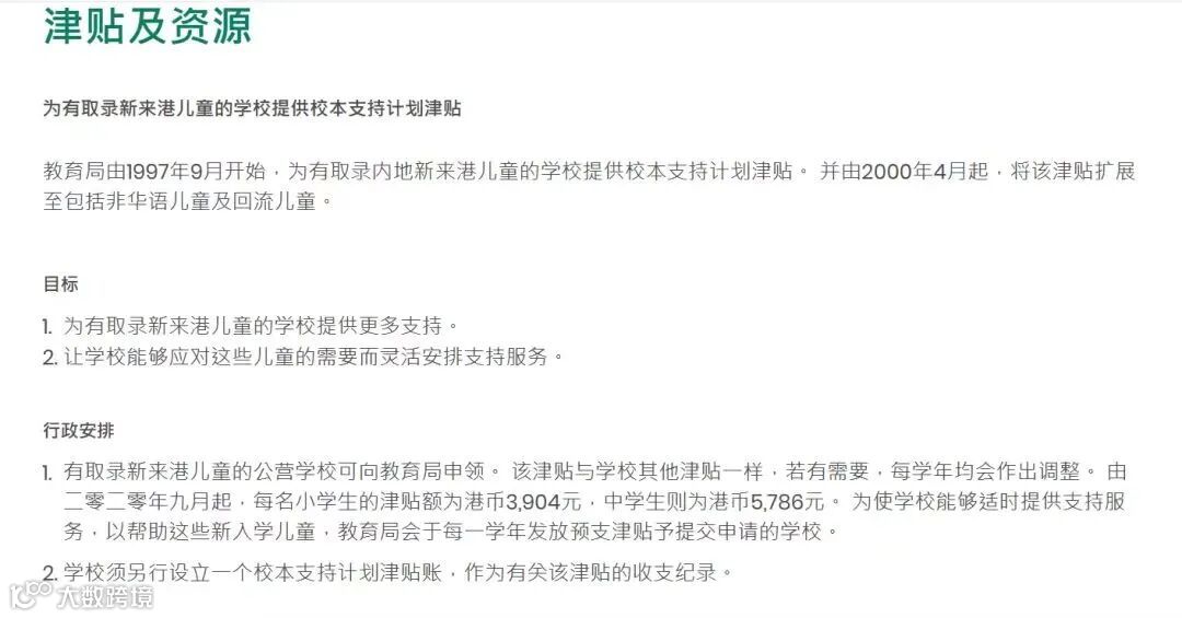 香港教育局从1997年开始,为有取录新来港儿童的学校提供「校本支援计划津贴」,如果一所公营学校录取新来港儿童,可向教育局申领一定的津贴,该津贴与学校其他津贴一样,若有需要,每学年均会作出调整,2022/23学年的校本支援计划津贴额,每名小学生由3,931元调整至4,002元, 中学生则由5,827元调整至5,932元,不过申请的学校必须将不少于50%的津贴额用作帮助内地新来港儿童学习英语、非华语儿童或回流儿童学习中文或英语,不少于30%的津贴额用来帮助这些儿童个人发展及适应社会。