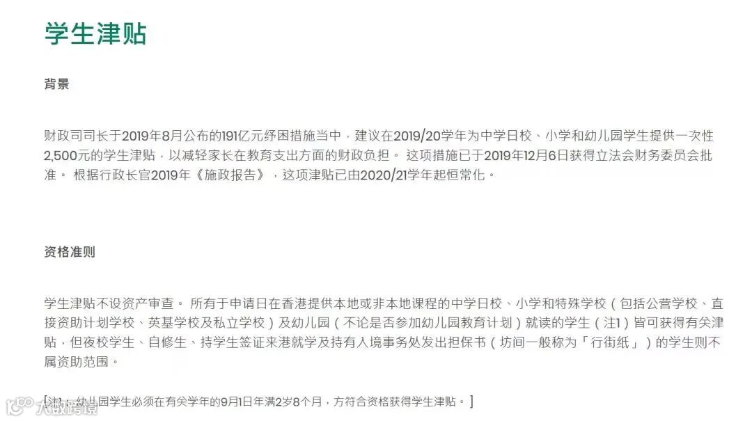 香港自2020/21年度起,实行“学生津贴恒常化”,给香港的学生每年发放津贴额度2500港元,学生津贴几乎涵盖了全港所有的幼儿园至中六(高三)段的学生,含公立、私立和国际学校以及福利署资助的特殊幼儿中心的学生、读启动课程的新来港学生、职校生,到香港(官津学校)读书不但可以免学费,还可以领取津贴。这个津贴每年9月份可递交申请,符合资格的学生可以通过在线申请或纸质申请,即使是新到港的香港插班生如在对应学年当年的6月30日前入学,也可申请当年的学生津贴。