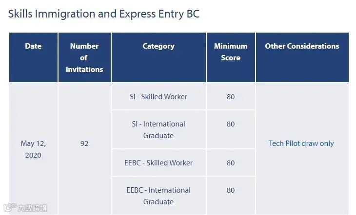 当地时间 2020年5月12日,BC省移民局公布新一轮技术移民 (仅针对29个特快审批职业) 抽选结果:本轮抽选共计发出92份邀请, 常规雇主担保类项目抽选分数线80分, 所有类别分数线相比上轮下降5分。