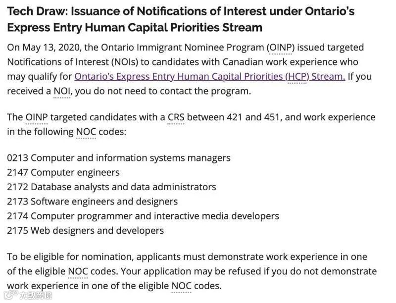 受邀人群:拥有加拿大工作经验的科技行业的EE申请人 (OINP-HCP Tech Draw)。