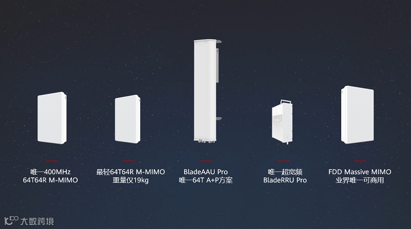 四个“唯一”分别是业界唯一400MHz超宽带64T64R Massive MIMO,业界唯一64T A+P解决方案BladeAAU Pro,业界唯一低三频合一、中三频合一BladeRRU Pro,以及业界唯一可商用的FDD Massive MIMO,全面满足运营商不同频段、不同场景的建网需求,带来带宽、容量、体验、维护效率的全面提升;一个“最轻”是业界最轻64T64R Massive MIMO,重量低至19千克,比上代业界最轻产品整整轻了6kg,持续以单人可操作的轻量化设备降低网络建设成本。