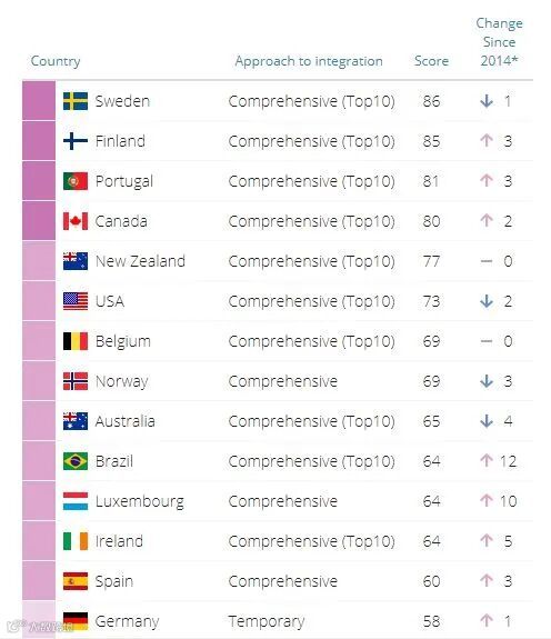 加拿大在本项评分中获得满分(100分),位居世界第一!奉行多元文化主义的加拿大,制定了诸多强有力的人权法律和制度来解决歧视问题。正在是在加拿大政府对移民群体的融合政策影响下,加拿大本地人对移民群体的接受度之高甚至超越了政府本身的融合政策指数。