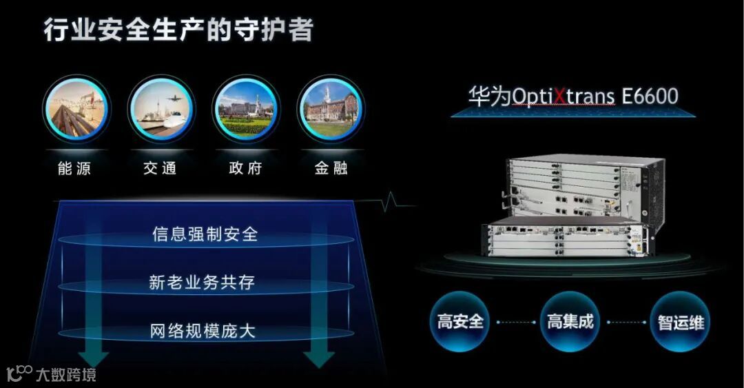 华为OptiXtrans E6600系列产品是业界首款内置Liquid OTN技术的光传送平台,具有高安全、高集成、智运维的创新价值,可保障生产业务的绝对安全,一网承载所有业务,是那些首要满足国家信息安全强制保护等级要求,同时对网络架构简化和运维效率提升有迫切诉求的行业的理想选择,特别适用于能源、交通、政府、教育、金融、制造等作为智慧城市生命体重要组成的行业,为它们构建全光大动脉支撑全业务数字化转型。