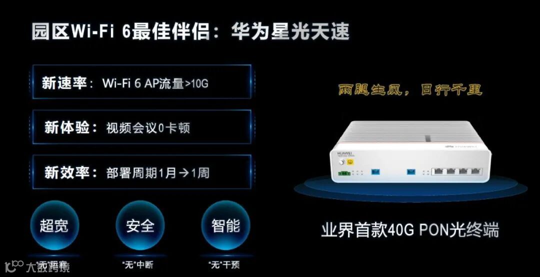 其中,华为星光天速S892E是业界首款支持40G PON的光终端,支持快速保护倒换和自动配置,可有效应对园区面临的传输带宽不足、可靠性差、部署效率低等挑战,实现超宽“无”阻塞、安全“无”中断、智能“无”干预,是园区Wi-Fi 6的最佳伴侣,广泛适用于企业办公、学校、机场、体育场馆等需要大带宽回传的场景。