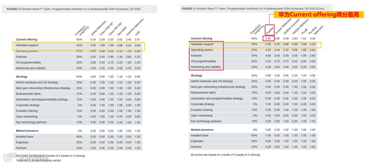 而在所有的16项评分标准中,华为的7项评分都获得了5.0/5.0满分的成绩,这7项得分分别代表产品硬件实力、产品硬件及操作系统战略、自动化及可编程战略、培训赋能、开放网络、工程师实力以及伙伴能力。这样的评分结果充分彰显了华为产品和服务的领先性。华为CloudEngine数据中心交换机是当之无愧的领导者。