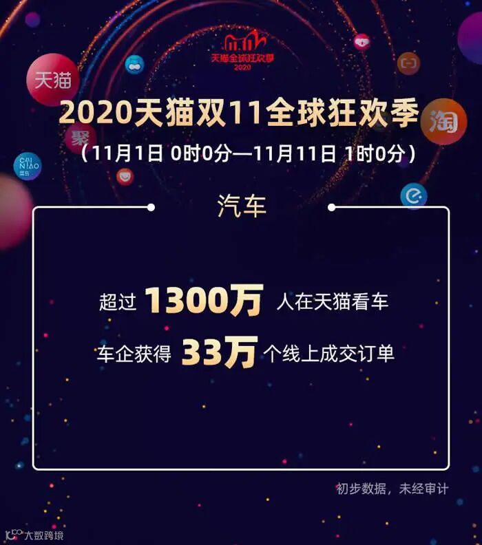 在这样的优惠力度下,在今年双11期间,通过天猫汽车线上看车人数超过1300万,订单总数超过33万辆。如今,以汽车为代表的大宗消费品已经成了天猫双11的常客。
