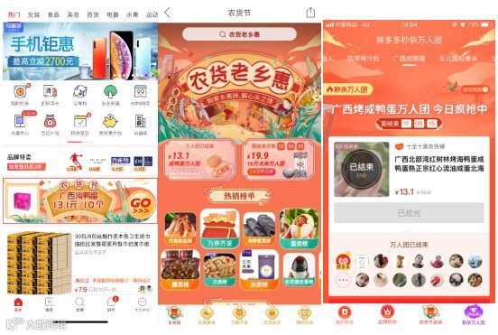 “很多新增用户是从农产品开始拼多多之旅的,买完三单,往往就能建立起信任感,接着买电器、手机等更高客单价的产品”,拼多多新农业事业部高级总监东原介绍,“作为一家技术驱动的互联网公司,拼多多主要通过商业模式创新,智能匹配供需,帮助农民把农产品顺利卖出去,让他们‘有产就有销,多劳能多得’”。如果说“多多果园”是通过产品开发来推动农产品上行,“农货节”就是拼多多从运营维度来推动农产品上行。