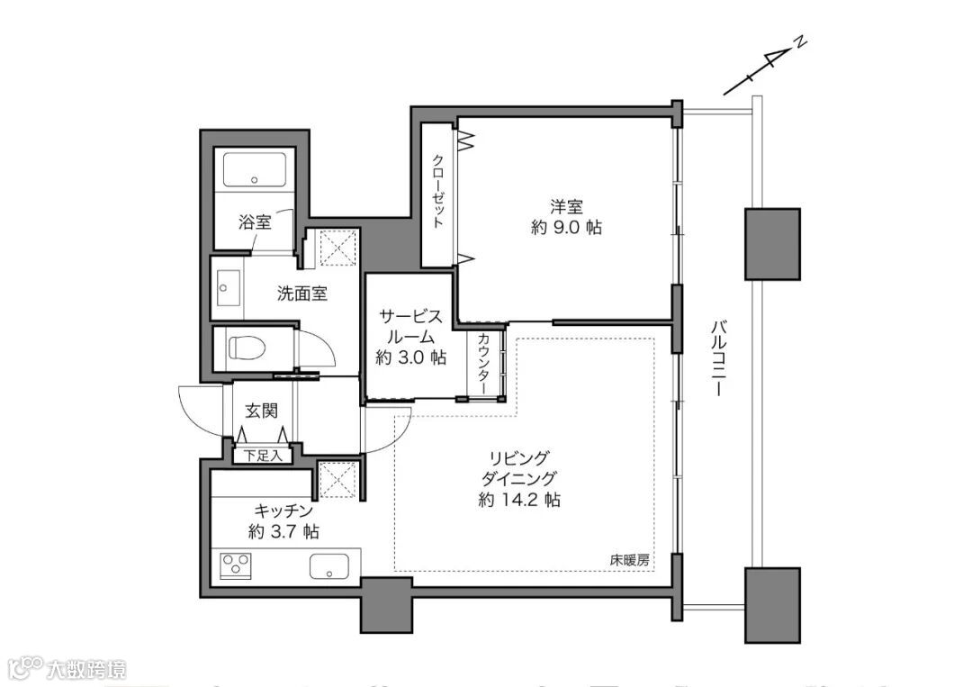 面积:2002年9月建,35层共47层,1LDK+WIC+サービスルーム,房产面积65.14平米,阳台面积11.04平米;