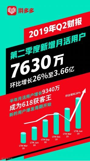 2019年上半年,拼多多进一步扩大全域用户规模增长的领先优势。