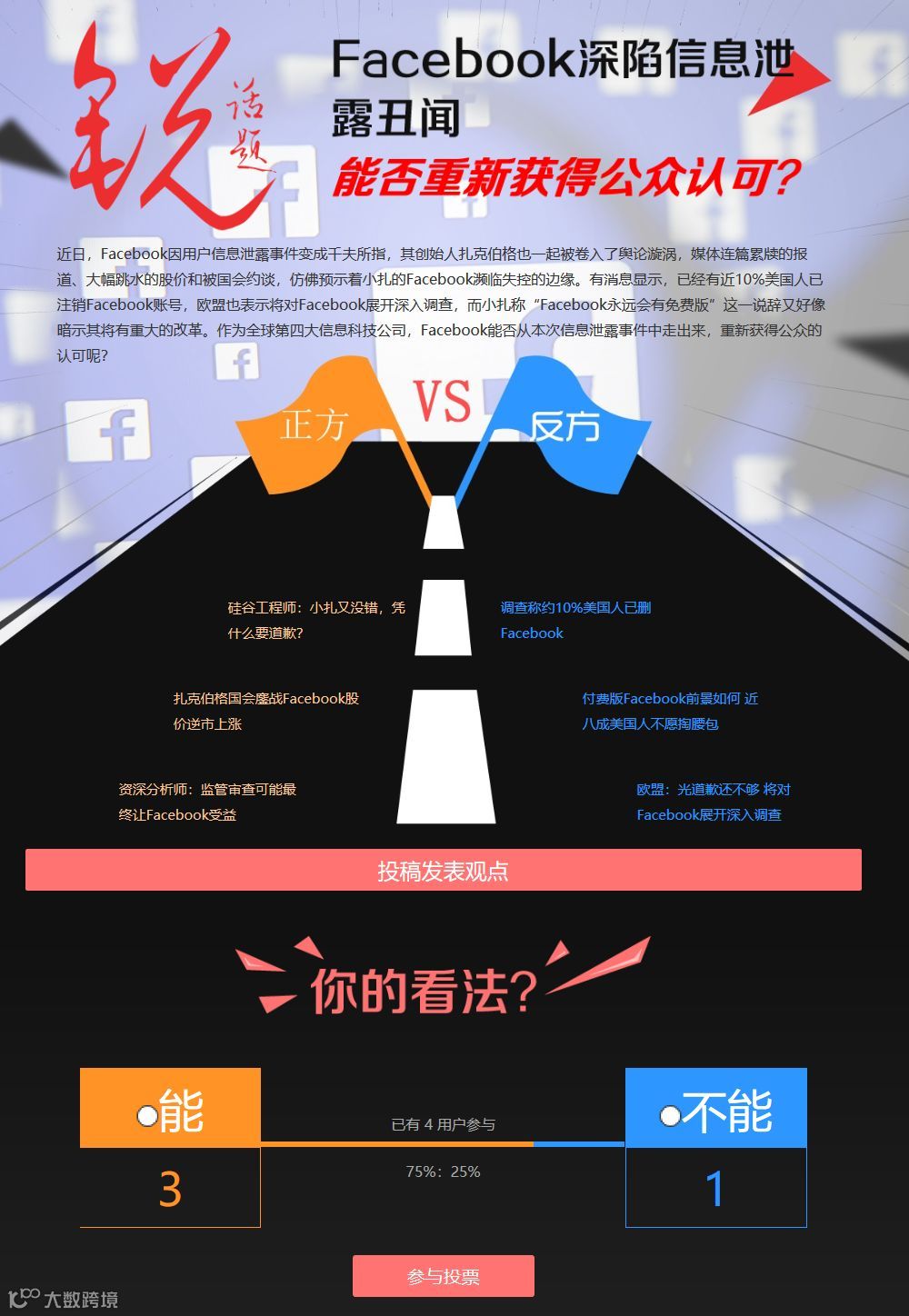 作为全球第四大信息科技公司,Facebook能否从本次信息泄露事件中走出来,重新获得公众的认可呢?点击阅读原文参与投票,秀出你的看法!