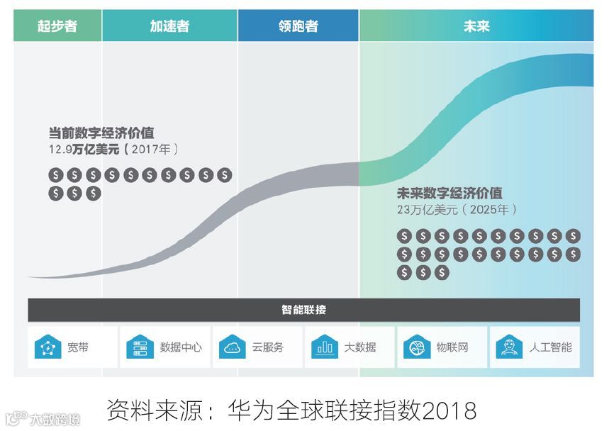 2018年我们调研发现,以ABCDE(AI、Block Chain、Cloud Computing、Data Tech、Edge Computing)为代表的新技术,正推动我们从数字经济时代迈向智能经济时代。新技术及其催生的新物种、新商业、新模式,正带领我们开启新增长,迈向新未来。这个新未来有多诱人?华为的报告显示,2017年全球数字经济规模为12.9万亿美元,到2025年将进一步增长到23万亿美元!