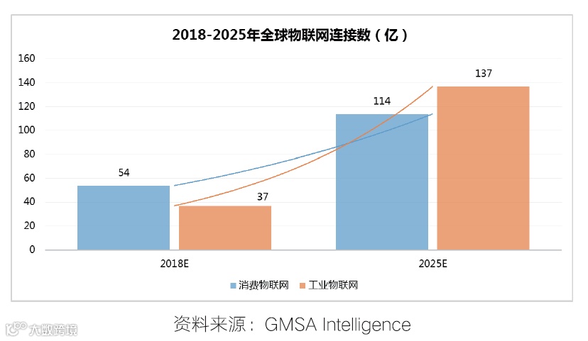 物联网层面,消费物联网遍地开花,工业物联网也蓄势待发,并展现出强劲增长潜力。数据显示,2018年全球物联网连接数约为91亿,其中消费物联网连接数占54亿,工业物联网连接数为37亿。而预计到2025年,工业物联网将以137亿的连接数超越消费物联网的114亿,成为物联网的主力。届时,物联网的直接和间接价值将是另外一个天地。