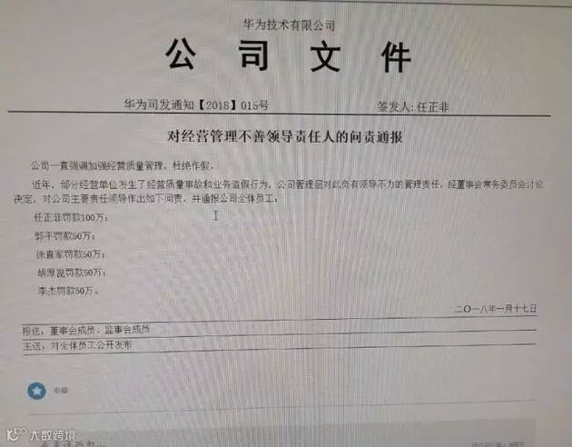 1月17日晚,“公司深读”注意到一份华为公司《对经营管理不善领导责任人的问责通报》,通报显示,因“部分经营单位发生了经营质量事故和业务造假行为”,华为公司对主要责任领导作出问责:,其中罚款100万;郭平罚款50万;徐直军罚款50万;胡厚崑罚款50万;李杰罚款50万。”