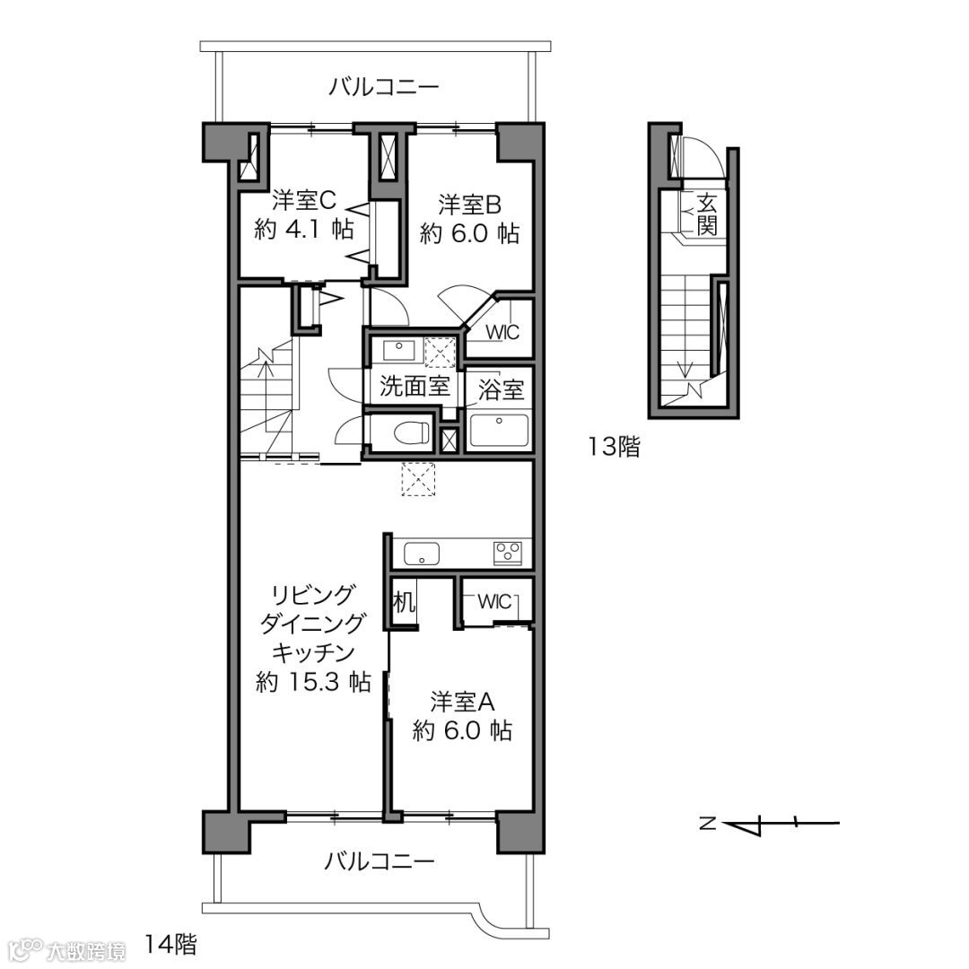 面积:1996年4月建,13、14层共14层,2LDK+WIC+2W+テレワークスペース,房产面积74.20平米,阳台面积17.41平米;