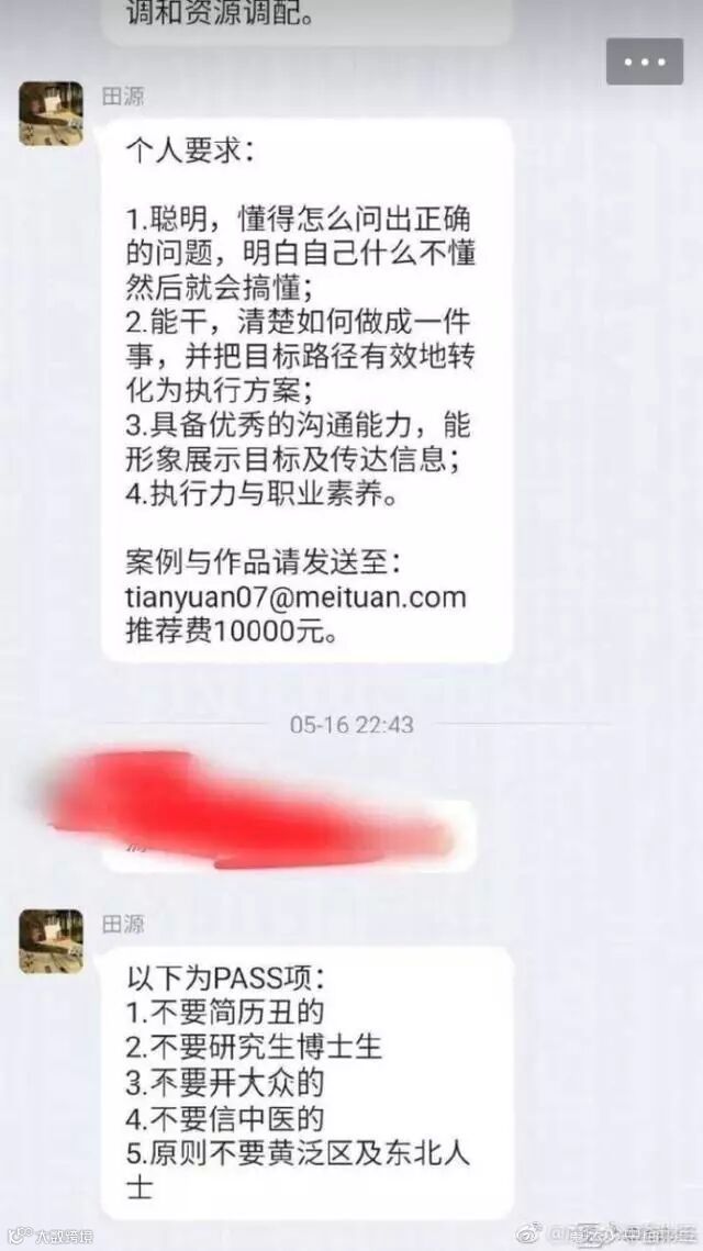 今年5月初,一则美团招聘的聊天截图流传于网络,引发讨论,招聘要求没人质疑,问题就是出在pass项上,像长得丑的不要、学历高的不要、开大众车的不要、信中医的不要、泛黄区以及东北人不要,这五条被舆论指责为招聘歧视。