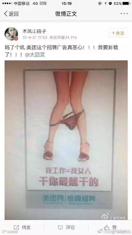 美团引发信任危机后,网友们扒出了它以前的校园招聘海报,上面画的是一个快要把内裤脱掉的女性双腿,下面则是写着“找工作=找女人,干你想干的。”被网友们吐槽物化女性,歧视女性。