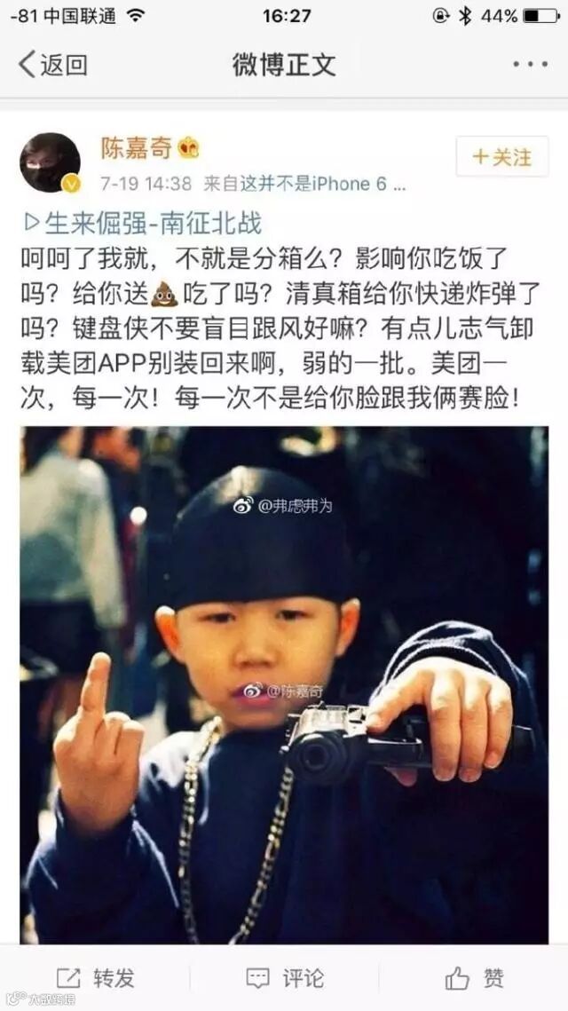 此后美团网运营主管陈嘉奇再添一把火,他说“不就是分箱么?影响你吃饭了吗?清Z箱给你快递炸D了…….有点儿志气卸载美团APP别装回来啊………”(目前他已改名,删除所有微博)