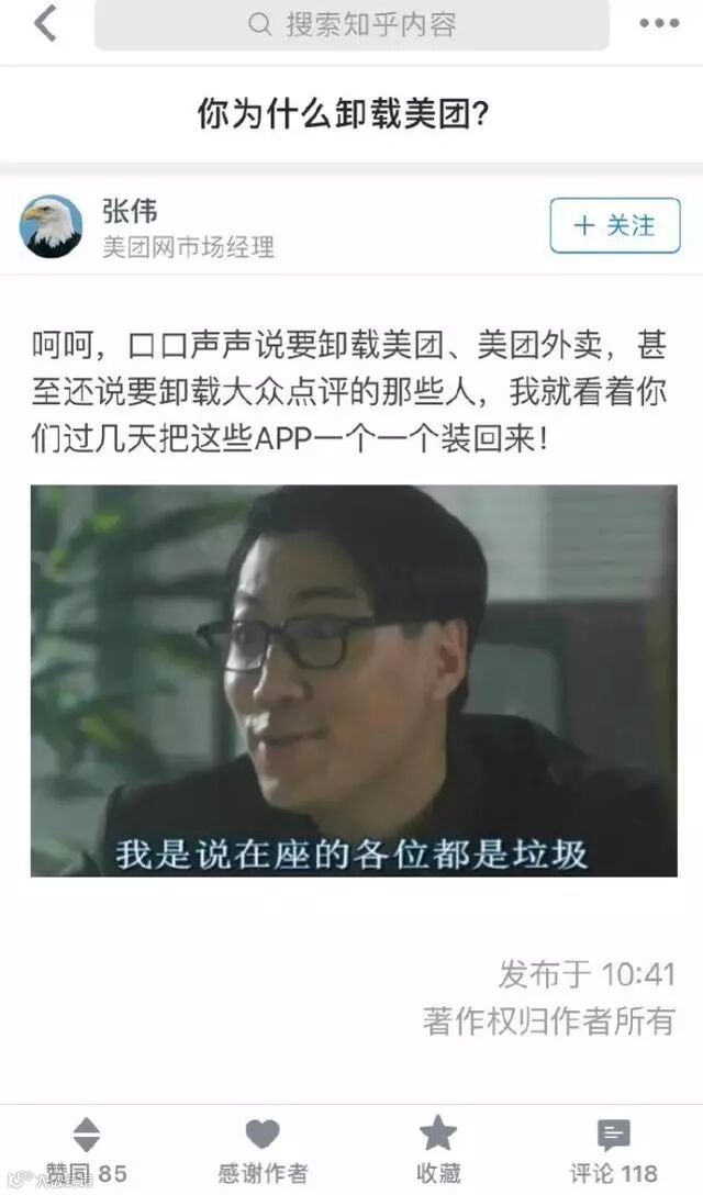 知乎上自称美团网市场经理的张伟说“口口声声说要卸载美团、美团外卖,甚至还说要卸载大众点评的那些人,我就看看你们过几天把这些APP一个一个装回来!”并配以嘲讽的图片。”(美团辟谣了说他是冒充的)