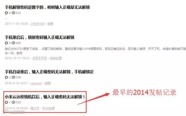 极客网小编于是也上MIUI论坛检索了一下,发现这个漏洞自从2014年起就一直存在,从“最早的云远程锁机,输入正确密码无法解锁”到“重启手机,输入正确密码无法解锁”。