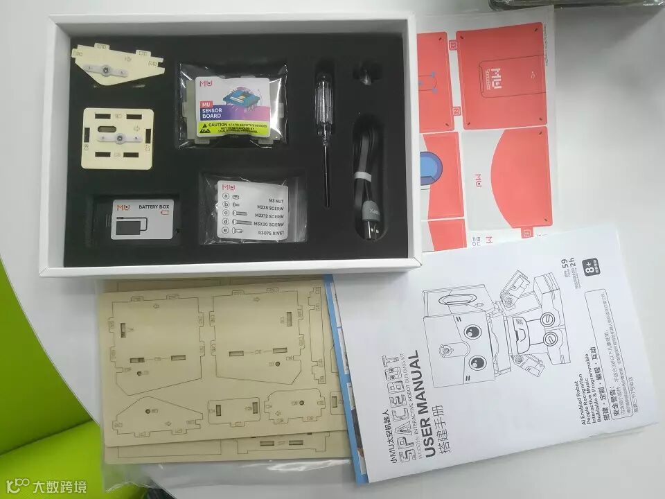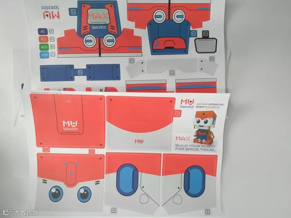 打开包装,小MU太空机器人的零部件,像贴纸、纸板、扬声器等井然有序的摆放着,从纸板上标明的字母序号看,小MU机器人设计的很用心,虽然对使用者动手能力要求高,但是只要按照说明书上依照序号组装,基本问题不大,说明书够厚够详细。