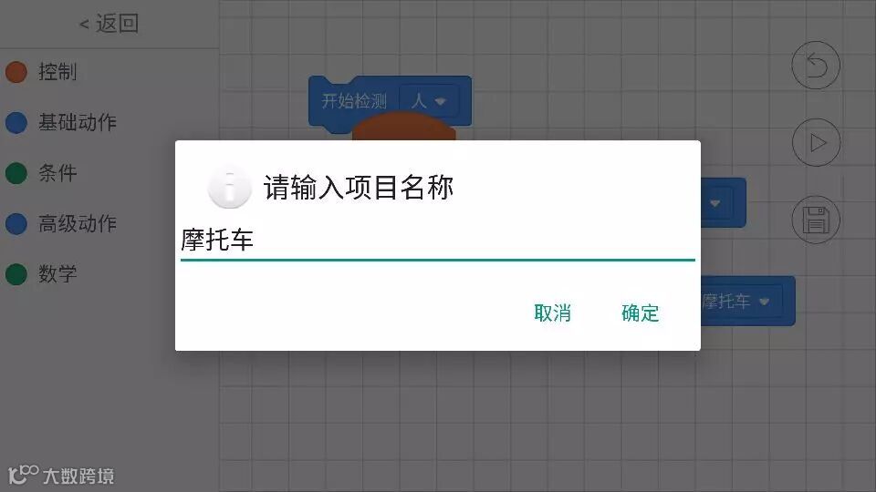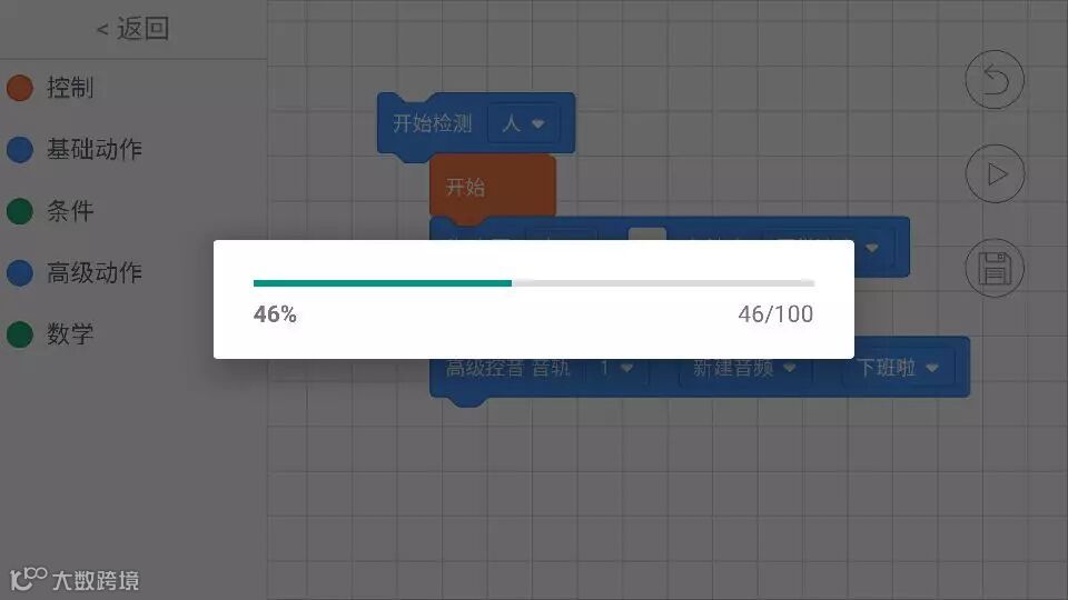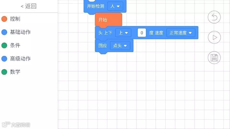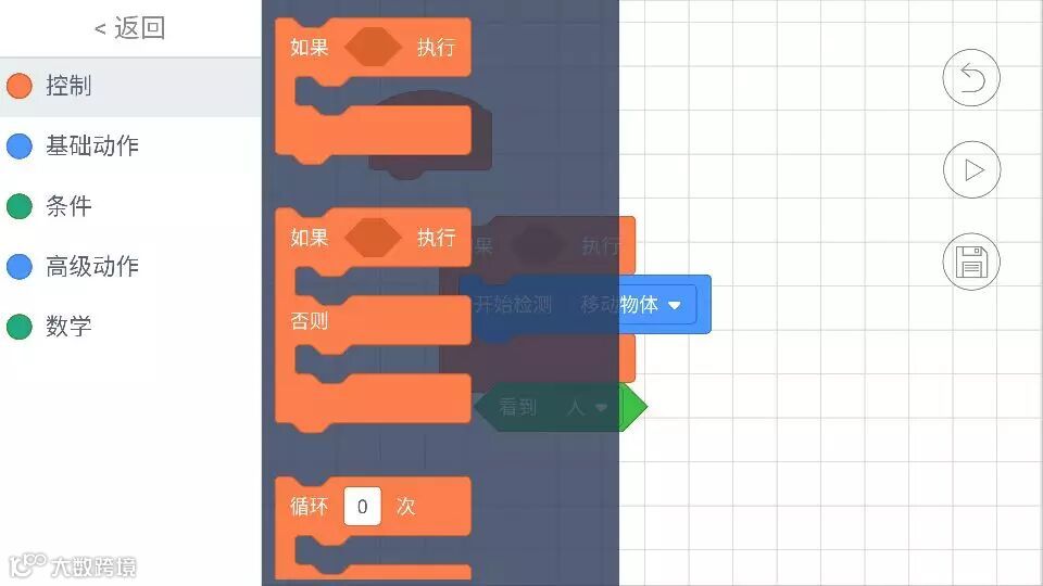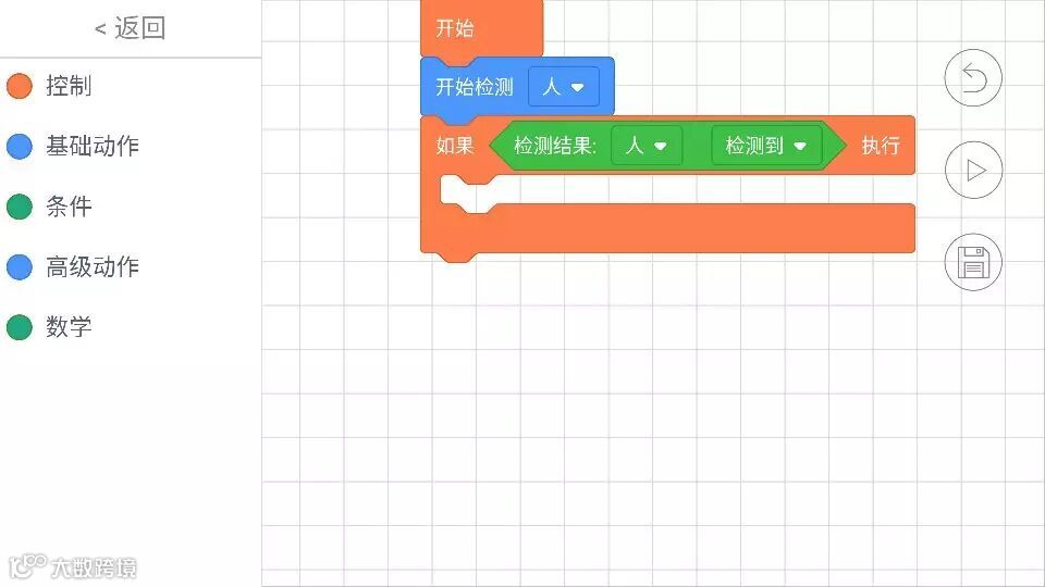 b.进入操作界面,我们发现小MU太空机器人的编程分为控制、基础动作、条件、高级动作、数学五部分,其中的语言大多数是我们高中时学过的if、while等条件循环知识,只不过小MU太空机器人把它变得可视化了,整个编程的过程就像堆积木、玩俄罗斯方块一样,哪里有空隙往哪里塞。